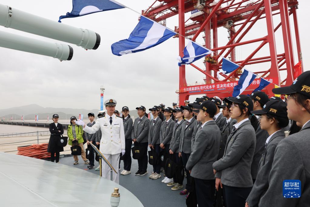 4月23日,海軍組織“戰(zhàn)艦與城市”雙擁共建主題活動(dòng),寧波市師生代表參觀寧波艦。新華社發(fā)(孟印祺 攝)