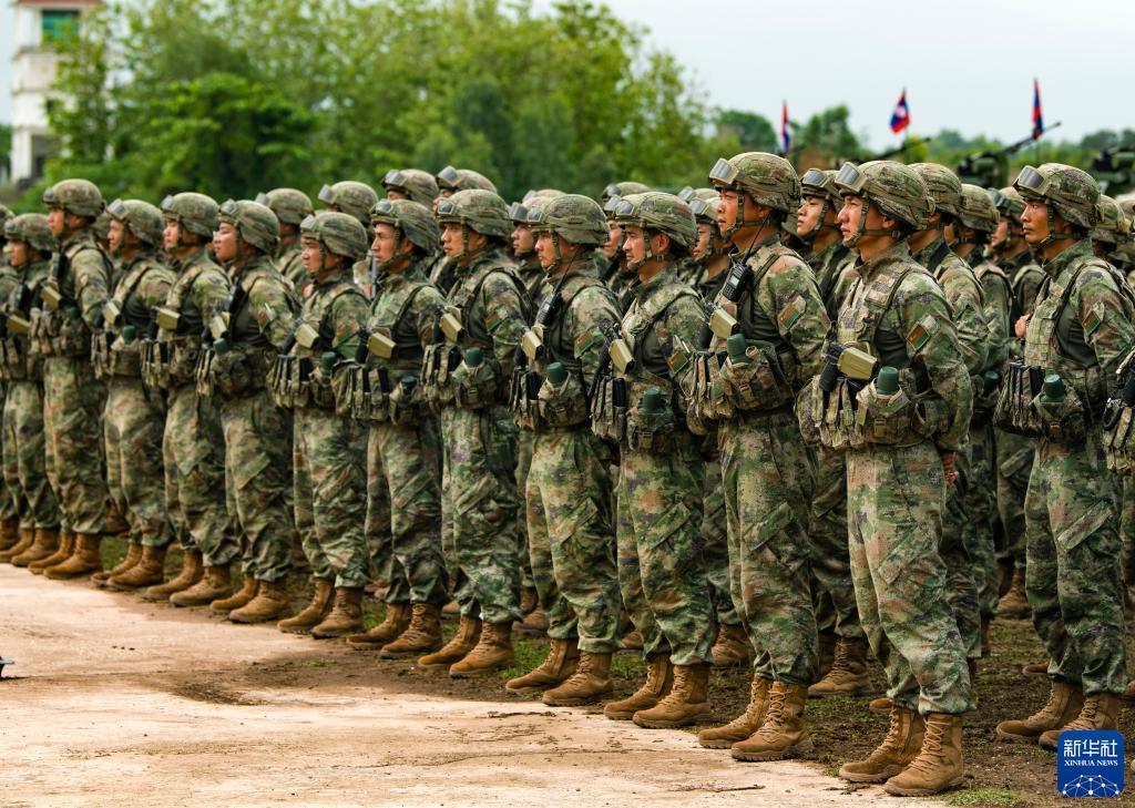 5月26日,中方參演官兵在老撾人民軍庫瑪?shù)W(xué)院訓(xùn)練場參加中老“友誼盾牌-2023”聯(lián)演結(jié)束儀式。新華社發(fā)(陽吉成 攝)