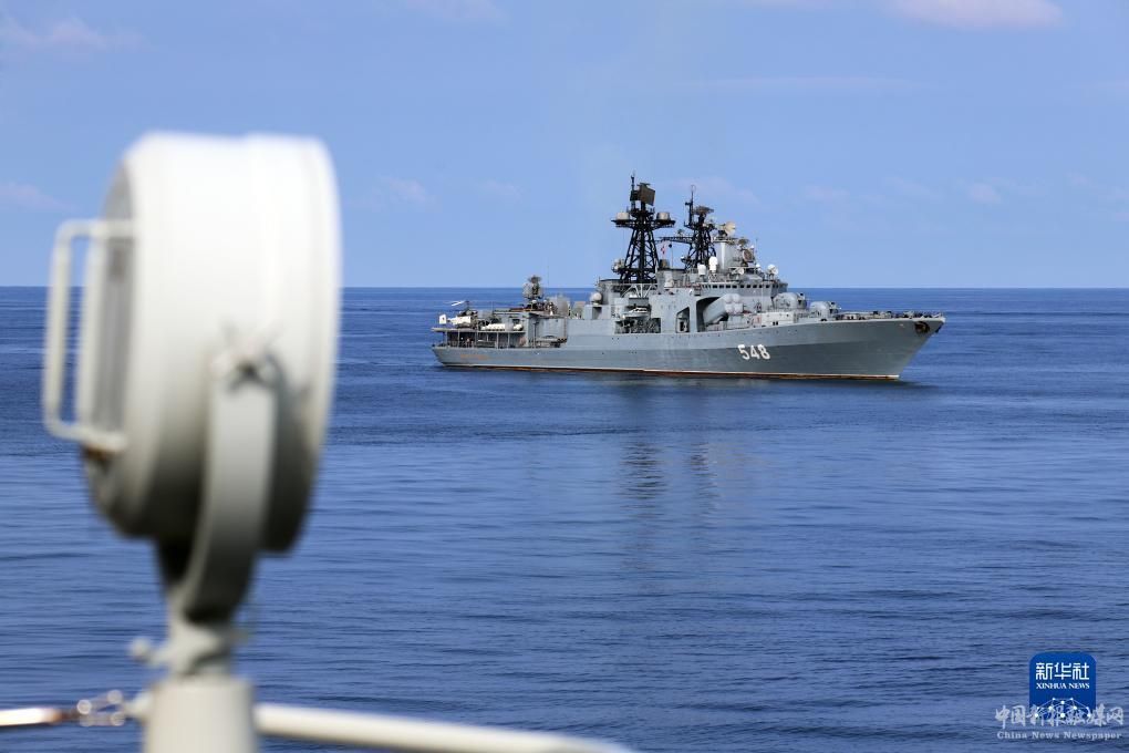 7月20日,在日本海某海域進(jìn)行的“北部·聯(lián)合-2023”演習(xí)中,俄羅斯“潘捷列耶夫海軍上將”號(hào)大型反潛艦與中方艦艇編隊(duì)航行。新華社發(fā)(張海龍 攝)