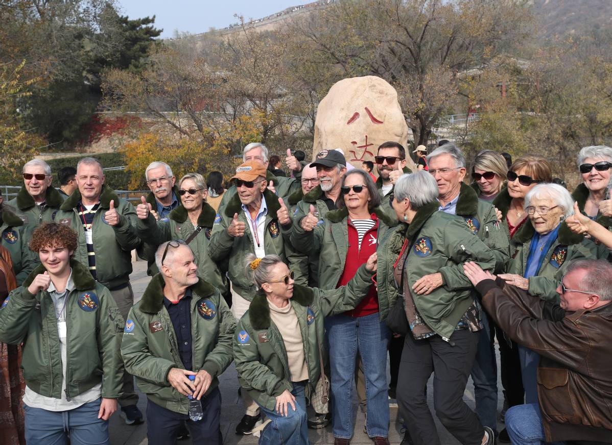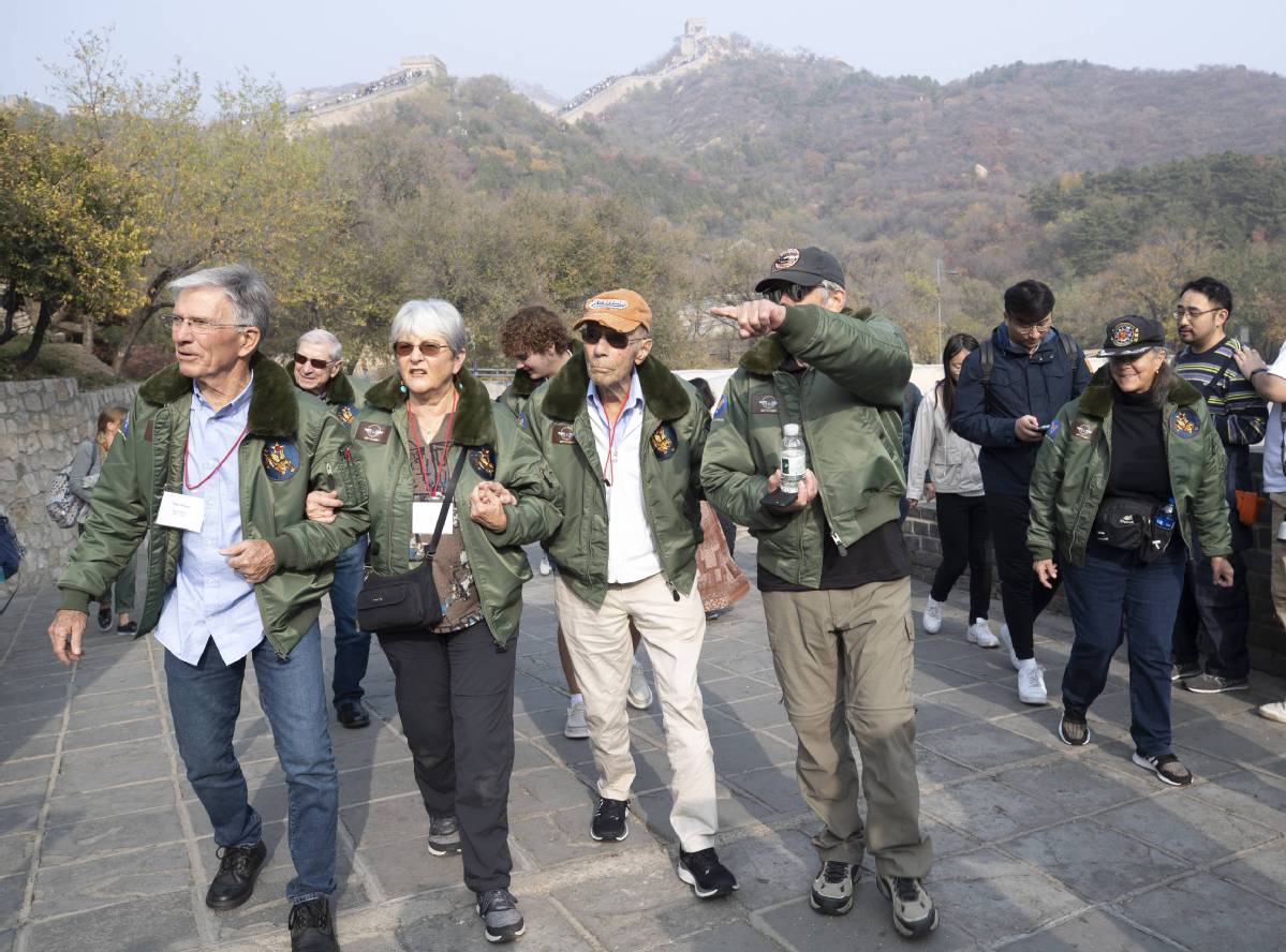 10月29日,飛虎隊(duì)老兵莫耶(前右二)在北京八達(dá)嶺長城參觀。中國日報(bào)記者 鄒紅 攝