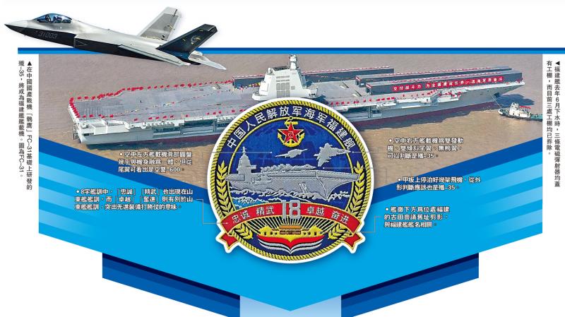 隨著海試之期日益臨近,首艘國(guó)產(chǎn)電磁彈射航母福建艦率先公布艦徽。在艦徽?qǐng)D案中,殲-35隱身戰(zhàn)機(jī)與空警-600固定翼預(yù)警機(jī)兩型戰(zhàn)機(jī)相繼從航母甲板彈射起飛,相當(dāng)于“官宣”印證了其艦載機(jī)配置。由俗稱“海盤(pán)子”的空警-600提供預(yù)警指揮和引導(dǎo),殲-35掛載“霹靂”“鷹擊”系列導(dǎo)彈執(zhí)行對(duì)空、海、陸打擊,這種空中力量搭檔,將全面提升航母編隊(duì)的預(yù)警指揮、信息感知、突防攻擊能力。