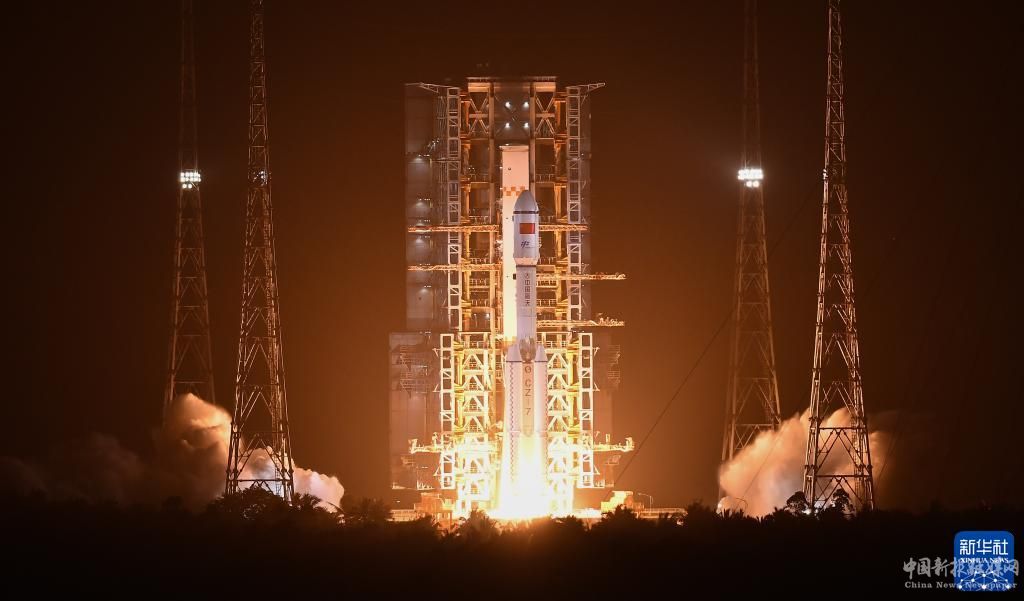 5月10日,搭載天舟六號貨運飛船的長征七號遙七運載火箭,在我國文昌航天發(fā)射場點火。新華社記者 楊冠宇 攝