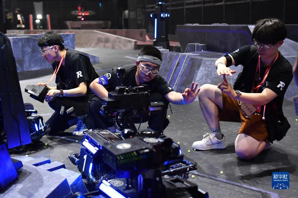 5月28日,大連交通大學TOE戰(zhàn)隊隊員在比賽間隙調(diào)試機器人。