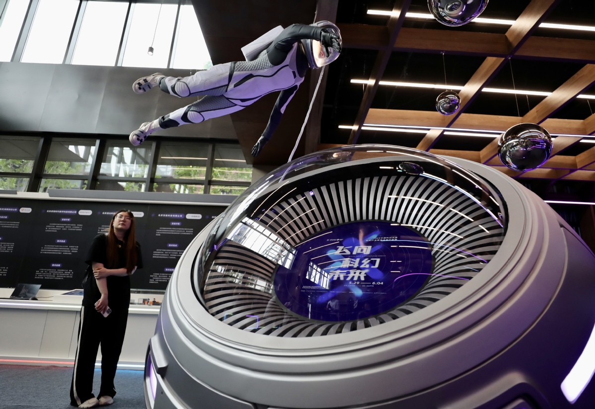 5月30日,2023中國科幻大會科幻產(chǎn)業(yè)新技術(shù)新產(chǎn)品展“交感穿梭”展區(qū),觀眾戴著VR眼鏡進(jìn)行沉浸式虛擬航天現(xiàn)實(shí)體驗(yàn)。中國日報(bào)記者 張威 攝