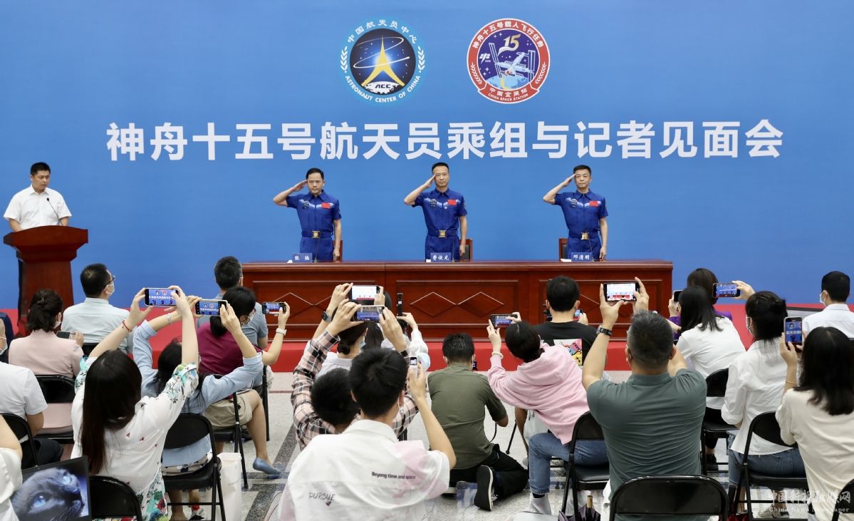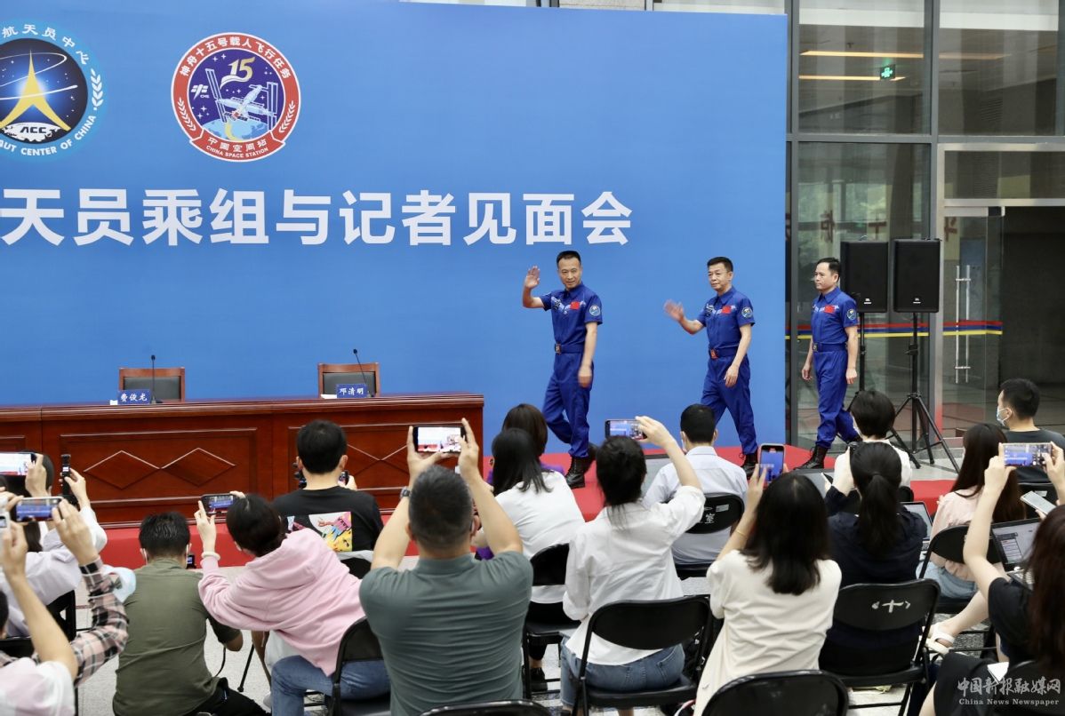 7月31日,神舟十五號(hào)航天員張陸、費(fèi)俊龍、鄧清明(從左至右)與公眾見面。供圖
