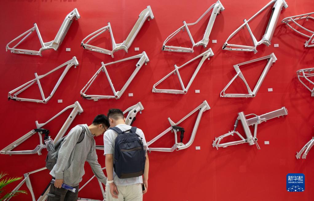 5月5日,在第31屆中國(guó)國(guó)際自行車(chē)展覽會(huì)上,觀眾參觀車(chē)架。