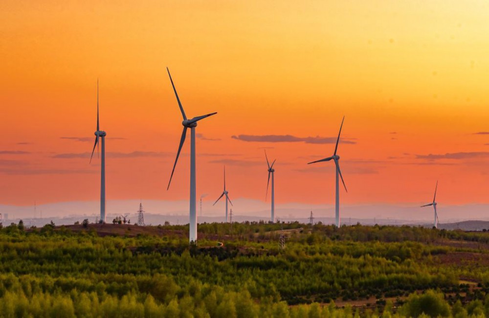5月23日清晨拍攝的興安盟烏蘭浩特市呼和馬場風力光伏發(fā)電場內的風機。新華社發(fā)(王正攝)