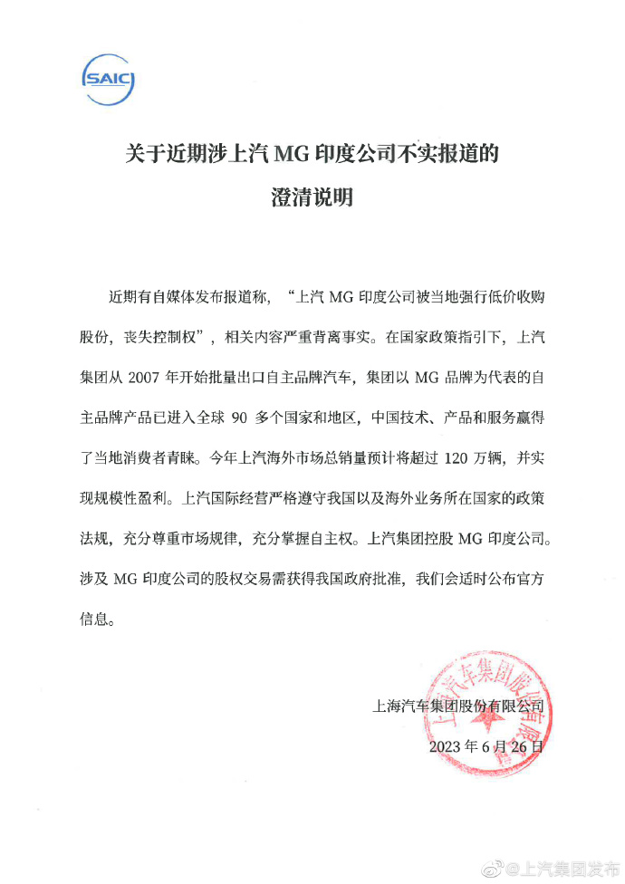關(guān)于近期涉上汽MG印度公司不實(shí)報(bào)道的澄清說明