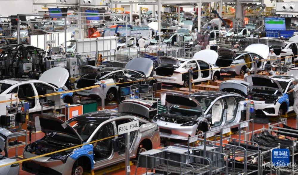 這是7月3日拍攝的廣州廣汽埃安第一智造中心新能源汽車總裝車間生產線。