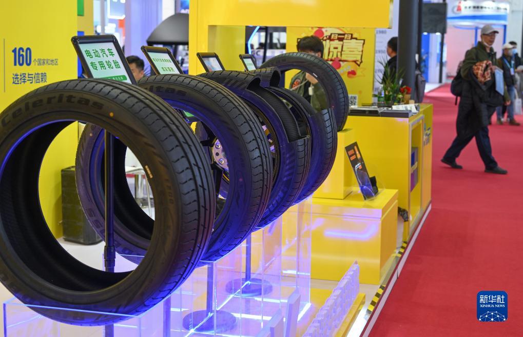 在智能汽車鏈展區(qū),山東華盛橡膠有限公司展臺展示電動汽車專用輪胎(11月30日攝)。