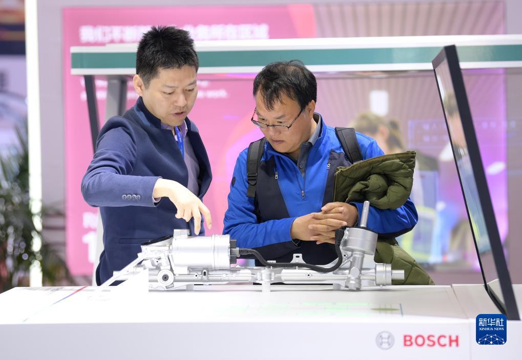 在智能汽車鏈展區(qū),一位參觀者(右)在博世(中國)投資有限公司展臺向工作人員了解電動助力轉(zhuǎn)向系統(tǒng)(11月30日攝)。