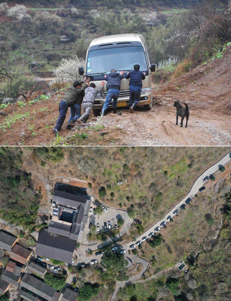 上圖:在廣西融安縣東起鄉(xiāng)崖腳村銅板屯,村民將汽車推出泥潭(2014年2月22日攝);下圖:汽車??吭阢~板屯的旅游公路上(2021年2月17日攝)。