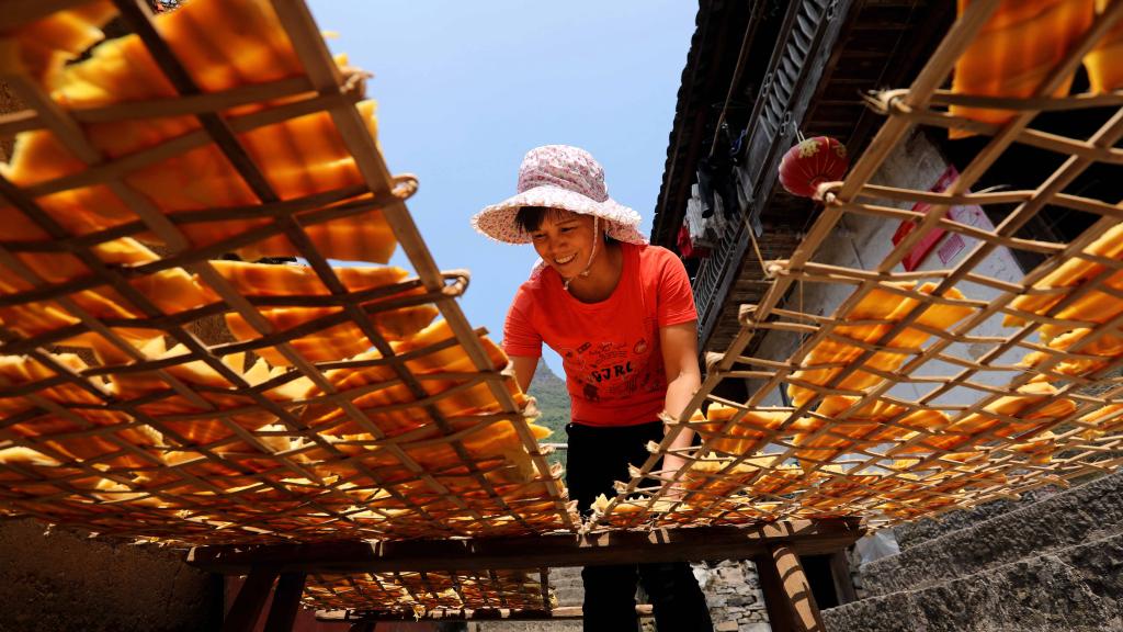 銅板屯村民羅偉枝在晾曬筍干(2018年8月25日攝)。新華社記者 張愛林 攝