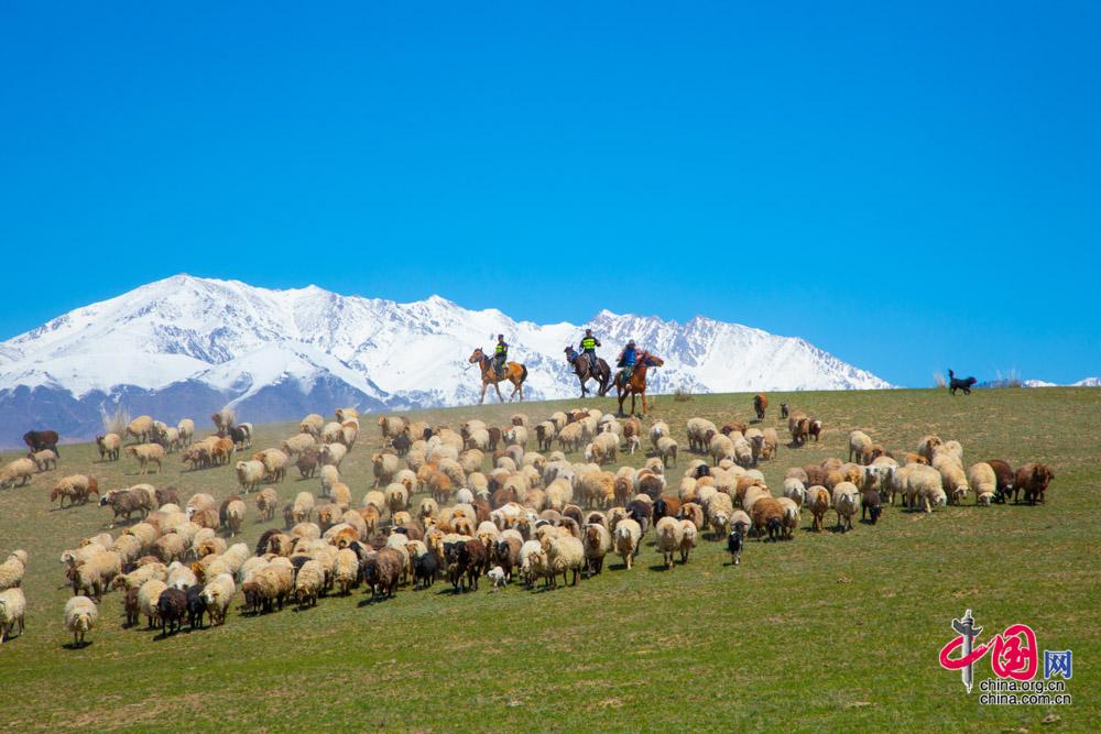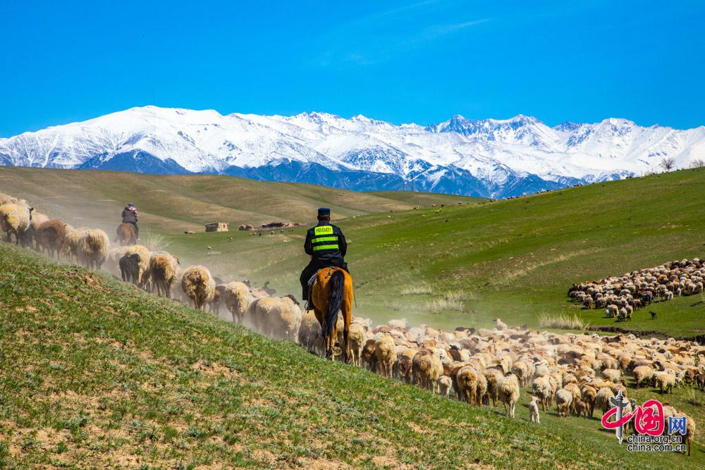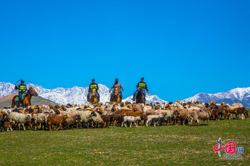 中國網(wǎng)訊(記者 趙娜 通訊員 王鵬飛、鄭明明、周航生)進入四月份,隨著氣溫逐漸升高,新疆伊犁邊境高海拔地區(qū)冰雪融化、草場逐步返青,生活在當(dāng)?shù)氐哪撩耜懤m(xù)開啟了一年一度的春季轉(zhuǎn)場,成千上萬只牲畜從烏拉海溝陸續(xù)遷徙至水草充沛的呼爾賽春草場。為守護牧民,幫助牧民順利安全將牧畜轉(zhuǎn)場,2023年4月23日,3名由新疆伊犁邊境管理支隊紅卡子邊境派出所民(輔)警組織成立“馬背上的護牧隊”,攜帶食物、日常使用藥品等物資,認真勘察轉(zhuǎn)場路線,隨時關(guān)注天氣變化,維護秩序,解決轉(zhuǎn)場途中遇到的困難,全程跟進護送20余公里,直到牧民及羊群全部安全到達牧場。