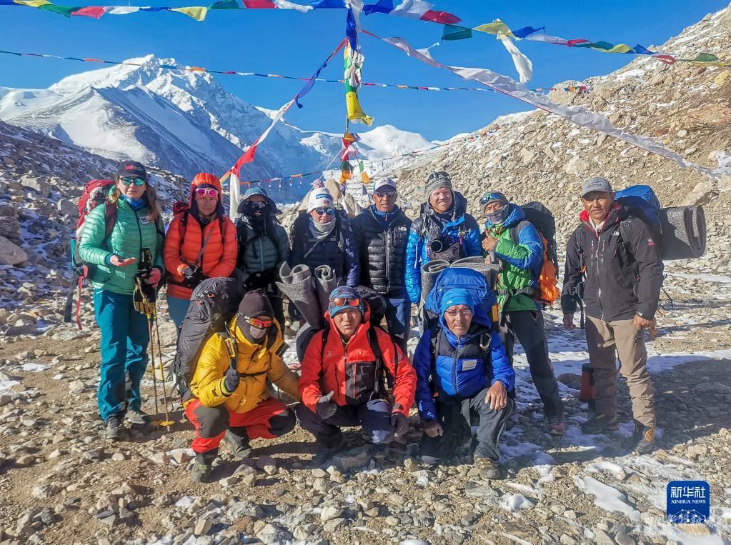 董紅娟(后排左三)在開(kāi)始攀登希夏邦馬峰前與隊(duì)友合影留念(4月23日攝)。新華社發(fā)(頓巴 攝)