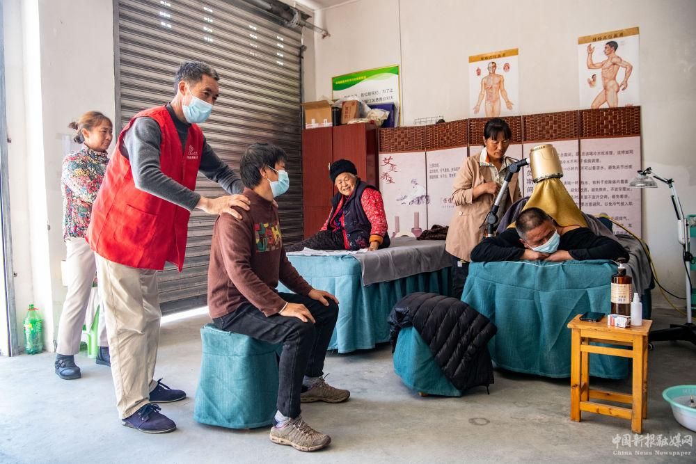 在重慶市綦江區(qū)安穩(wěn)鎮(zhèn)崇河村由當(dāng)?shù)孛裾块T建立的普惠養(yǎng)老場(chǎng)所“自然健康屋”,志愿者為老人提供免費(fèi)理療服務(wù)(2022年10月18日攝)。新華社記者 唐奕 攝