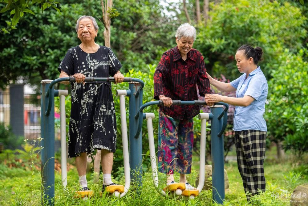 工作人員(右一)輔助老年人在湖南省常德市漢壽縣社會(huì)福利中心健身(2023年6月20日攝)。新華社記者 陳思汗 攝