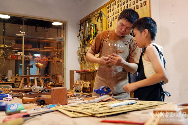 楊翔軍在教孩子們制作木制小擺件 圖/虞向軍