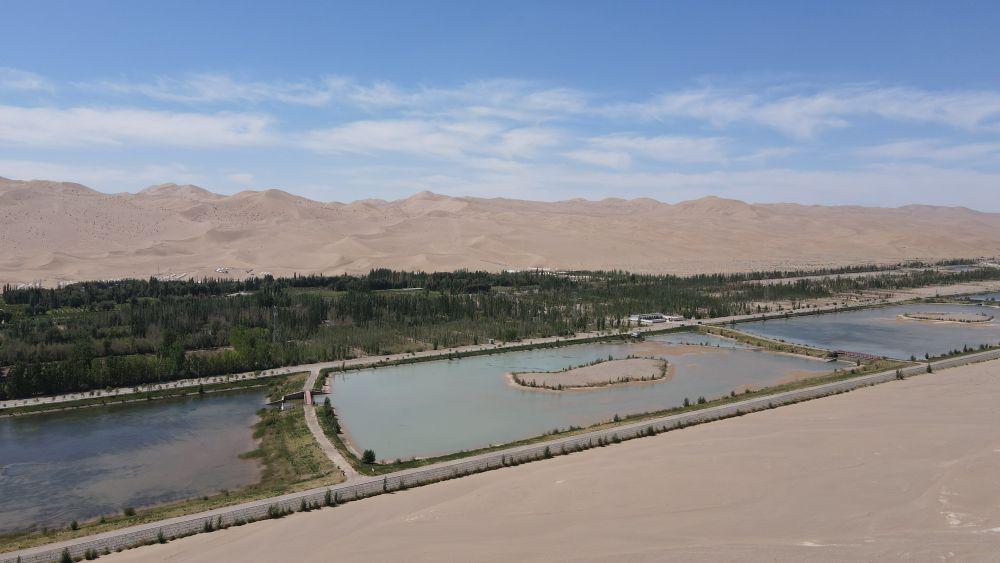 這是敦煌鳴沙山北麓的月牙泉一角(2023年6月7日攝,無人機照片)。新華社記者 張智敏 攝