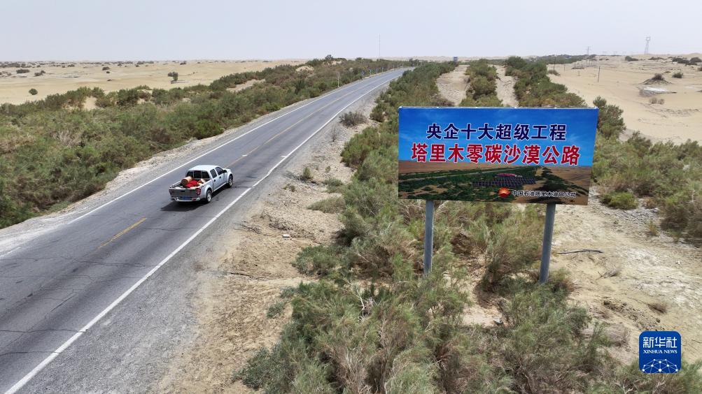 在位于新疆的塔克拉瑪干沙漠腹地,中國首條貫穿塔克拉瑪干沙漠的等級公路——塔里木零碳沙漠公路,像一條綠色長龍蜿蜒曲折,在沙漠深處延伸。