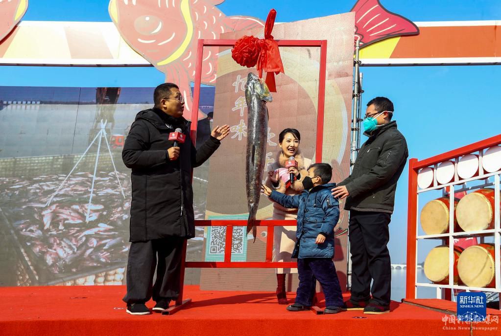 12月31日,在泰州市姜堰區(qū)溱湖冬捕作業(yè)現(xiàn)場,小朋友欣賞剛捕獲的“溱湖魚王”。