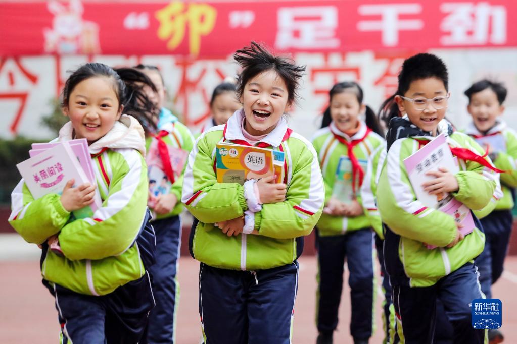 2月6日,安徽省淮北市第三實驗小學,學生們領(lǐng)到新課本。新華社發(fā)(萬善朝 攝)