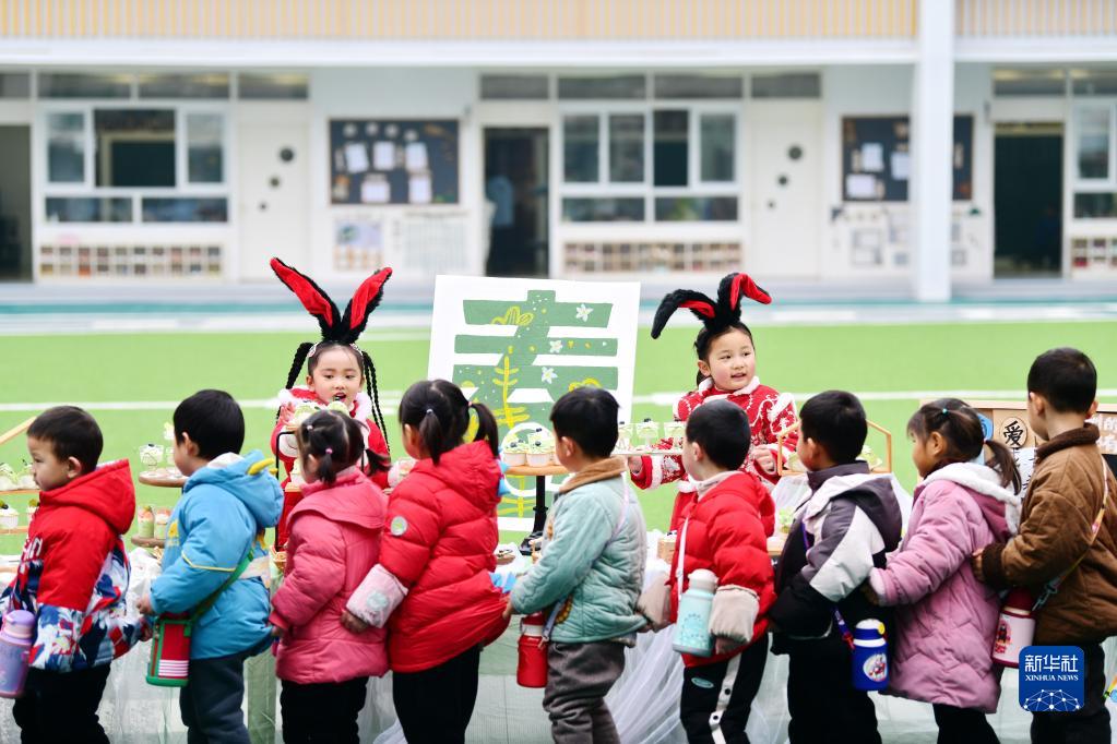 2月6日,安徽省阜陽市阜南縣育新幼兒園,孩子們在校園內(nèi)向同學打招呼。新華社發(fā)(呂乃明 攝)