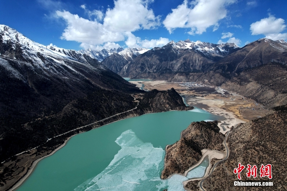 2月16日,西藏昌都,然烏湖半冰半水的湖面與雪山、藍(lán)天相互映襯,美如畫卷。(無人機(jī)照片)中新社記者 李林 攝