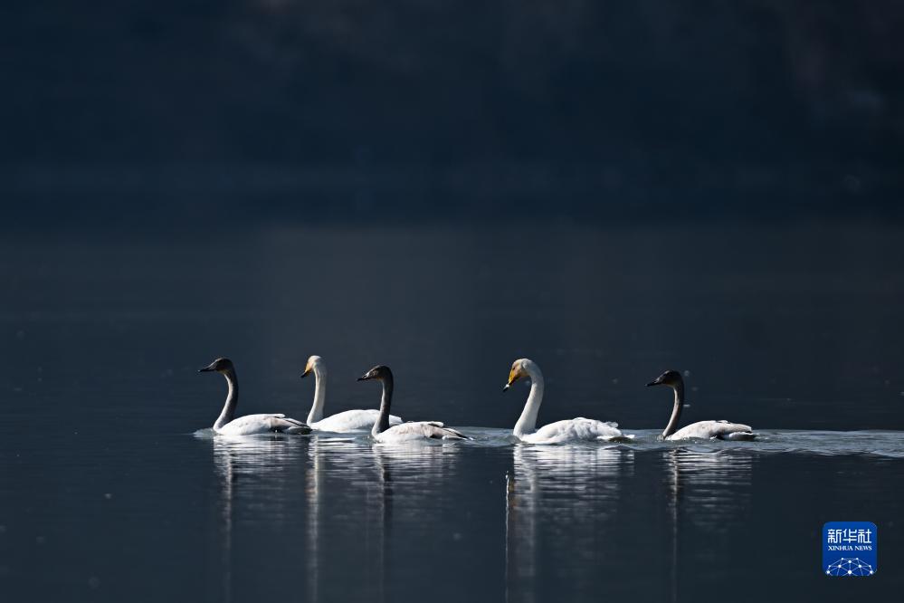 11月30日,一群天鵝在青海省海東市化隆回族自治縣群科鎮(zhèn)境內(nèi)的黃河上游弋。