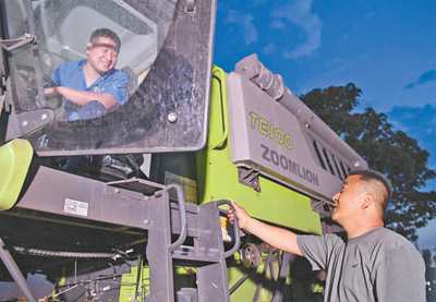 鏡頭故事·搶收小麥   今年夏天,小麥產(chǎn)量約占全國(guó)1/4的河南遭遇“爛場(chǎng)雨”。6月7日晚,河南安陽(yáng)市滑縣袁營(yíng)村黨支部書記吳東星(右)和農(nóng)機(jī)手溝通搶收小麥的注意事項(xiàng)。這天夜晚,4臺(tái)收割機(jī)要完成村里300畝麥田的搶收任務(wù)。   新華社記者 張浩然攝