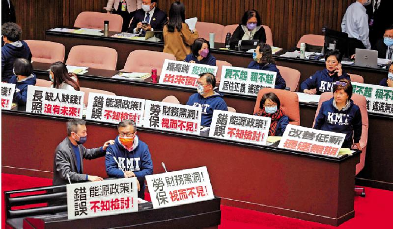 圖:2月17日,國民黨團(tuán)占據(jù)立法機(jī)構(gòu)發(fā)言席,杯葛陳建仁作施政報告。\中央社