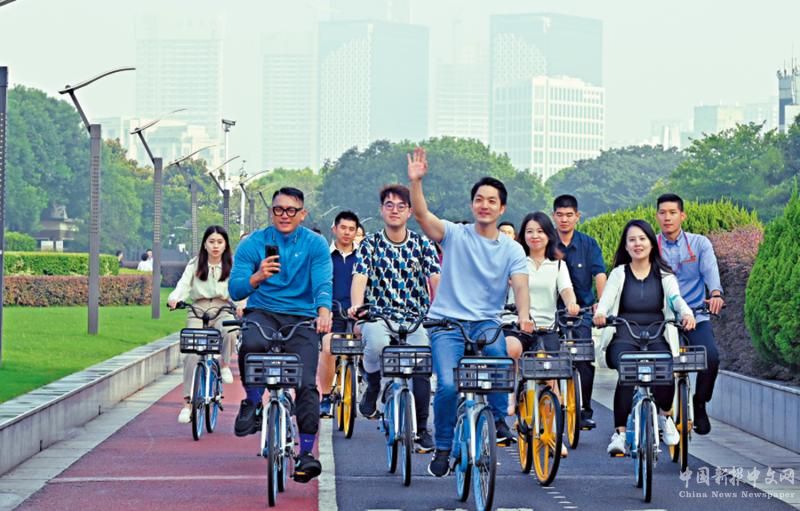 圖:臺(tái)北市市長(zhǎng)蔣萬(wàn)安8月31日在上海與臺(tái)青一起騎單車。/大公報(bào)記者張帆攝