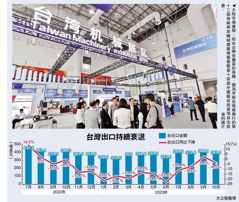【大公報(bào)訊】據(jù)中新社報(bào)道:因出口衰退、投資表現(xiàn)不如預(yù)期,臺當(dāng)局近日更新2023年臺灣經(jīng)濟(jì)增長率預(yù)測值為1.42%,較8月預(yù)測值下調(diào)0.19個(gè)百分點(diǎn),是近14年來新低。除了受全球經(jīng)濟(jì)疲軟影響外,臺灣地區(qū)出口連續(xù)12個(gè)月負(fù)增長,對臺灣經(jīng)濟(jì)造成嚴(yán)重沖擊。其中,今年前10個(gè)月臺灣對大陸出口總額同比下降18.2%。兩岸專家指出,大陸是臺灣地區(qū)第一大出口市場,兩岸進(jìn)出口貿(mào)易下降,必然沖擊臺灣經(jīng)濟(jì)。這是民進(jìn)黨當(dāng)局破壞兩岸關(guān)系造成的惡果。