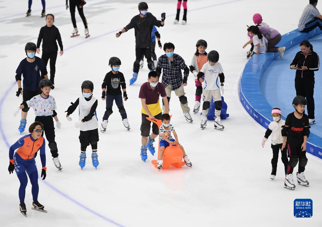 2022年10月2日,小朋友們?cè)趪?guó)家速滑館內(nèi)學(xué)習(xí)滑冰。新華社記者 張晨霖 攝