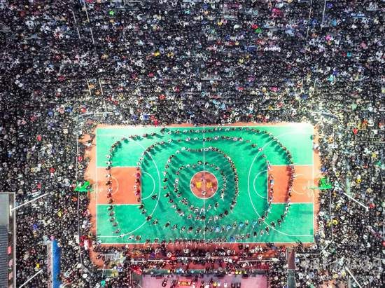 3月26日,比賽開(kāi)始前,苗族同胞在首屆“美麗鄉(xiāng)村”籃球聯(lián)賽總決賽賽場(chǎng)上跳舞(無(wú)人機(jī)照片)。新華社記者 歐東衢 攝