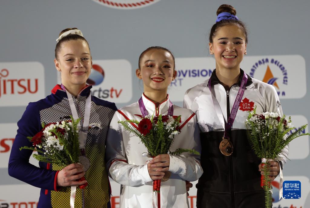 4月2日,冠軍中國選手俞涵悅(中)、亞軍羅馬尼亞選手加布麗埃拉(左)和季軍加拿大選手克里斯泰拉在頒獎(jiǎng)儀式上。新華社發(fā)(穆斯塔法·卡亞攝)