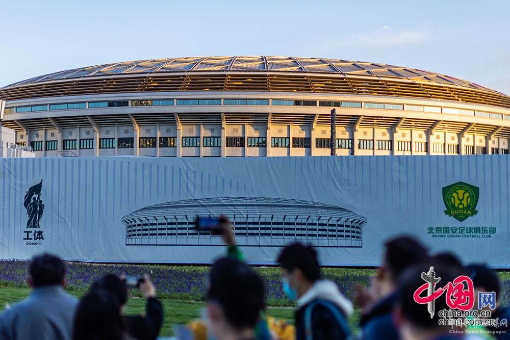 4月15日,改造復(fù)建后的北京工人體育場首次開放迎來觀眾。圖為球迷在球場外拍照留念。中國網(wǎng)記者 鄭亮攝