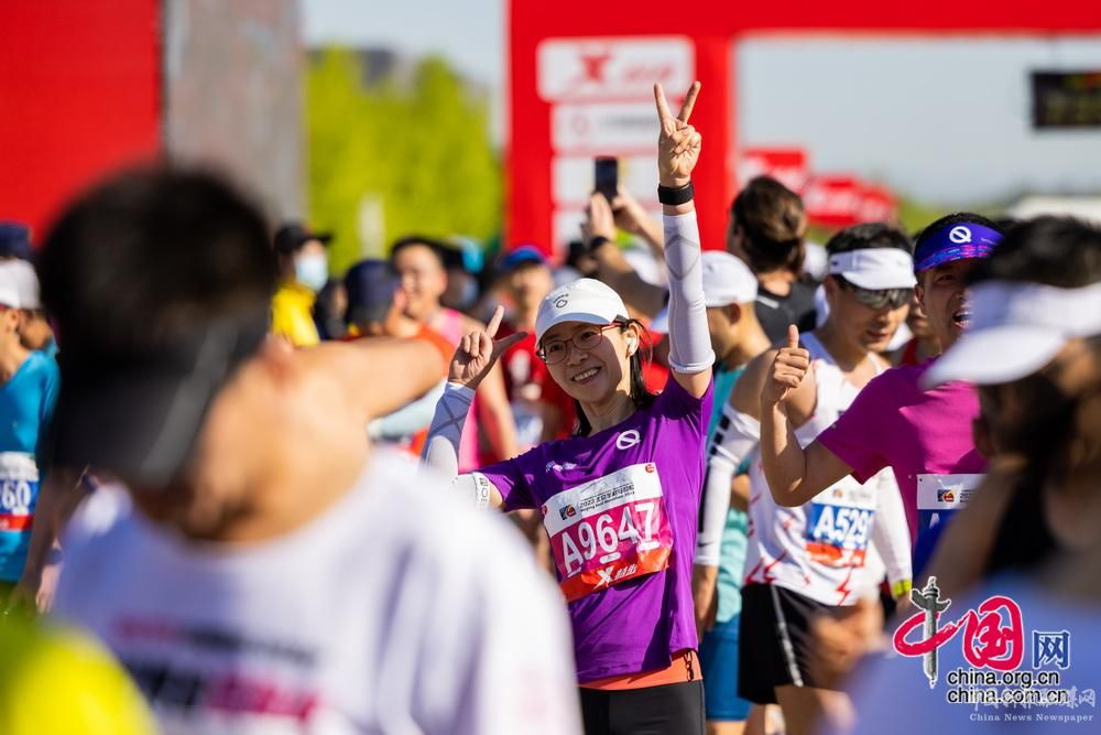 參加本次北京半程馬拉松的選手在鏡頭前展示跑者風(fēng)采。中國(guó)網(wǎng)記者 鄭亮攝