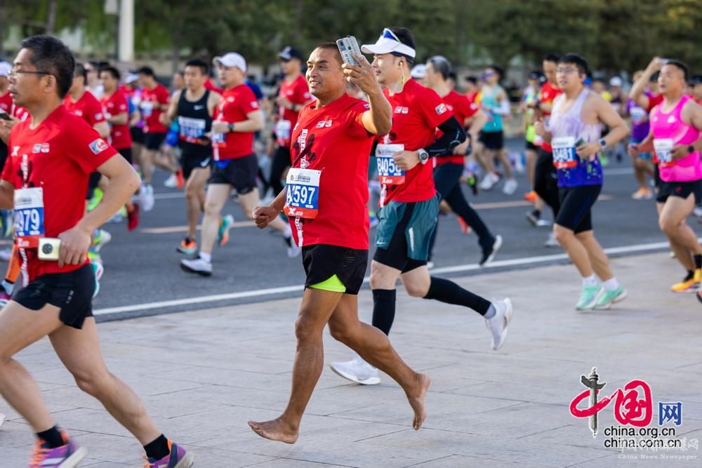 一名赤腳跑者出發(fā)向終點(diǎn)飛奔。中國(guó)網(wǎng)記者 鄭亮攝