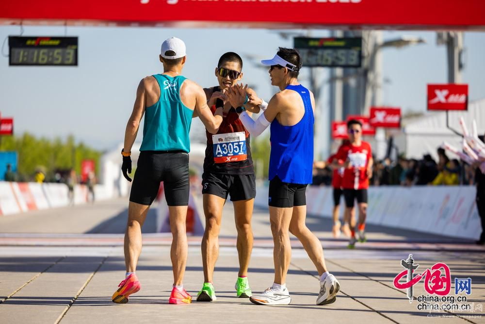跑過終點(diǎn)的參賽選手擊掌慶祝。中國(guó)網(wǎng)記者 鄭亮攝