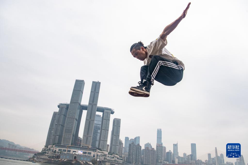 2023年4月21日,重慶躍飛跑酷隊員文舜堯在重慶朝天門對岸的江灘上展示跑酷動作。