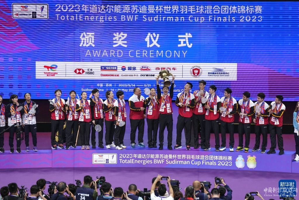 當(dāng)日,2023年蘇迪曼杯世界羽毛球混合團(tuán)體錦標(biāo)賽頒獎儀式在江蘇省蘇州市舉行。中國隊在決賽中以3比0戰(zhàn)勝韓國隊,奪得冠軍。