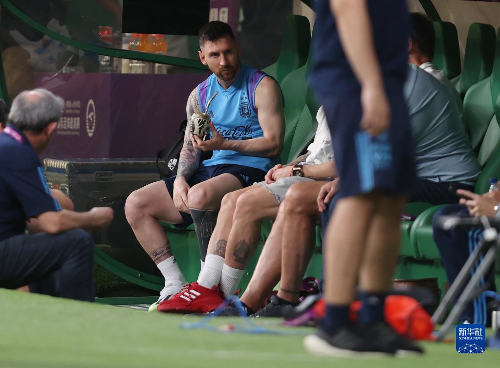6月14日,阿根廷隊球員梅西(左二)在訓練間隙喝馬黛茶。新華社記者 賈浩成 攝