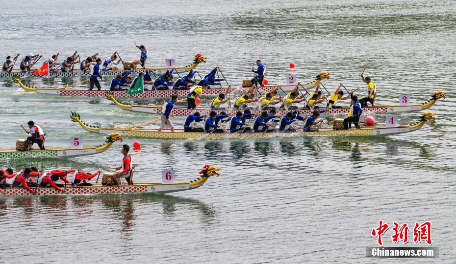 龍舟在清澈的江面劃出一道道美麗的波痕。