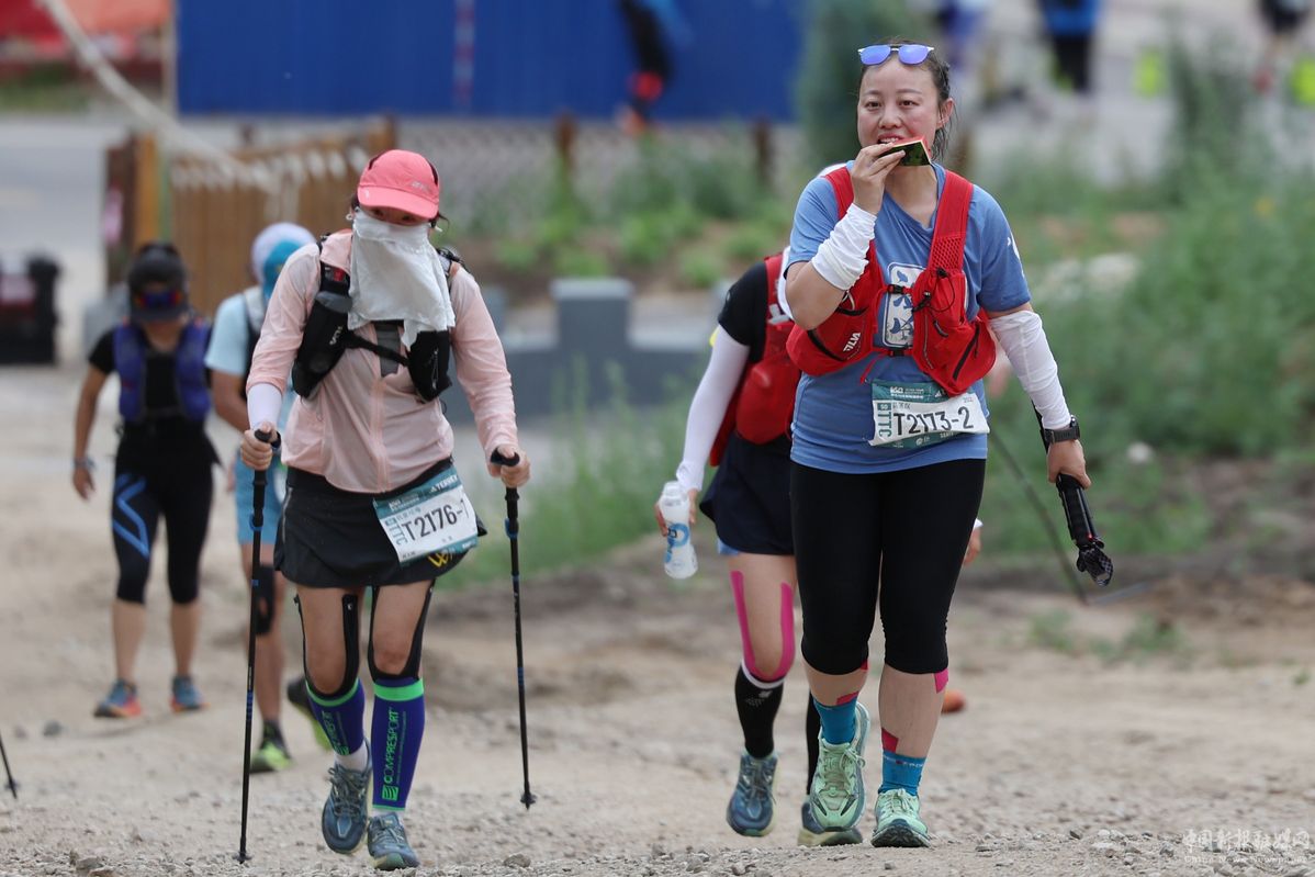 7月8日,50公里組,選手經(jīng)過補給點后吃西瓜。中國日報記者 魏曉昊 攝