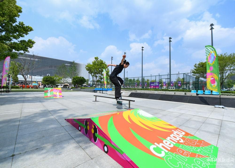 4月19日,滑板愛好者在成都東安湖體育公園練習滑板。新華社記者 王曦 攝