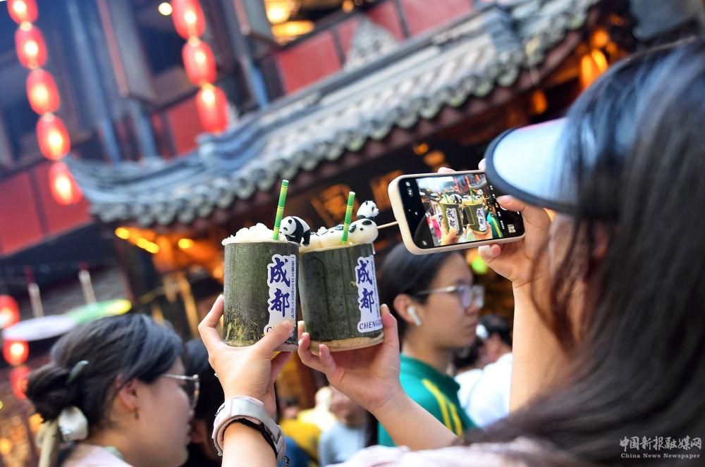 7月14日,兩名游客在成都錦里用手機拍攝剛剛購買的特色飲品。新華社記者 劉坤 攝