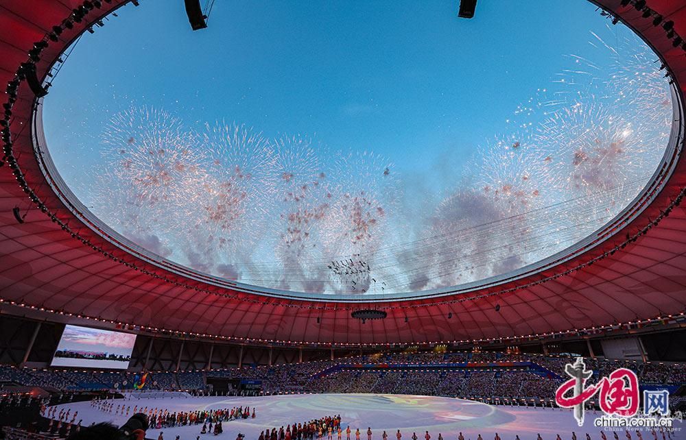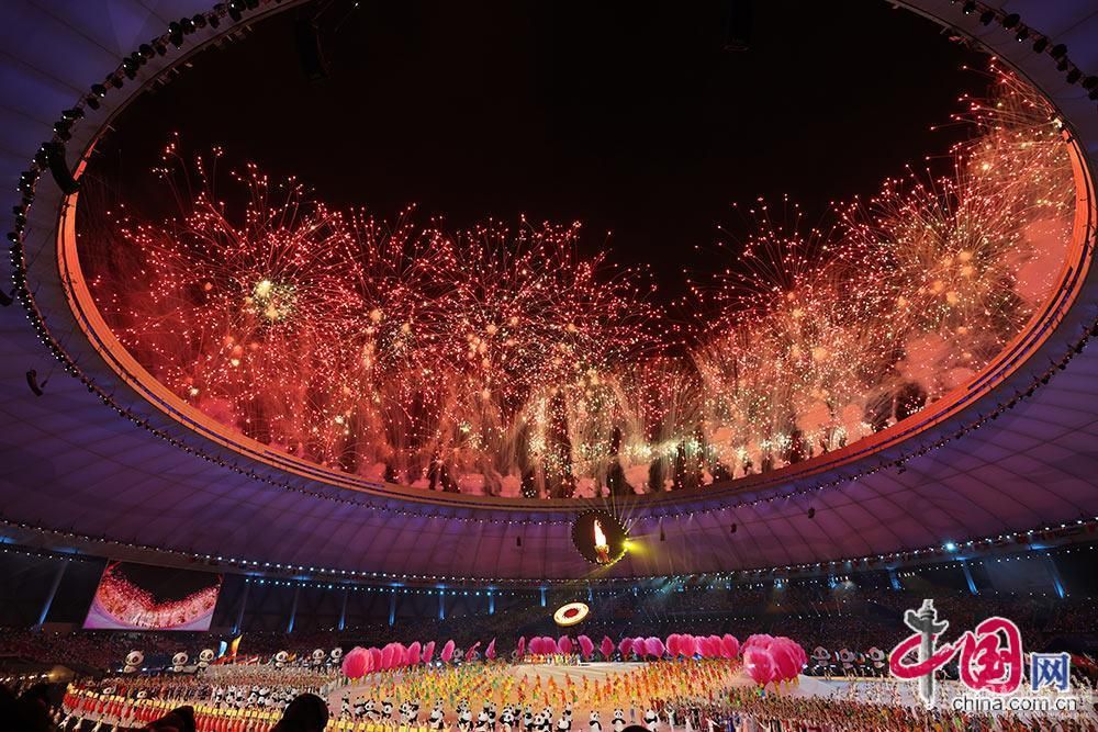 7月28日,第三十一屆世界大學生夏季運動會開幕式現(xiàn)場,大運會火炬點燃后場內煙花綻放。中國網(wǎng) 倫曉璇攝影
