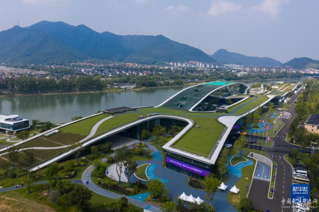 8月24日,空中俯瞰杭州富陽水上運動中心,屋頂被綠植覆蓋(無人機照片)。