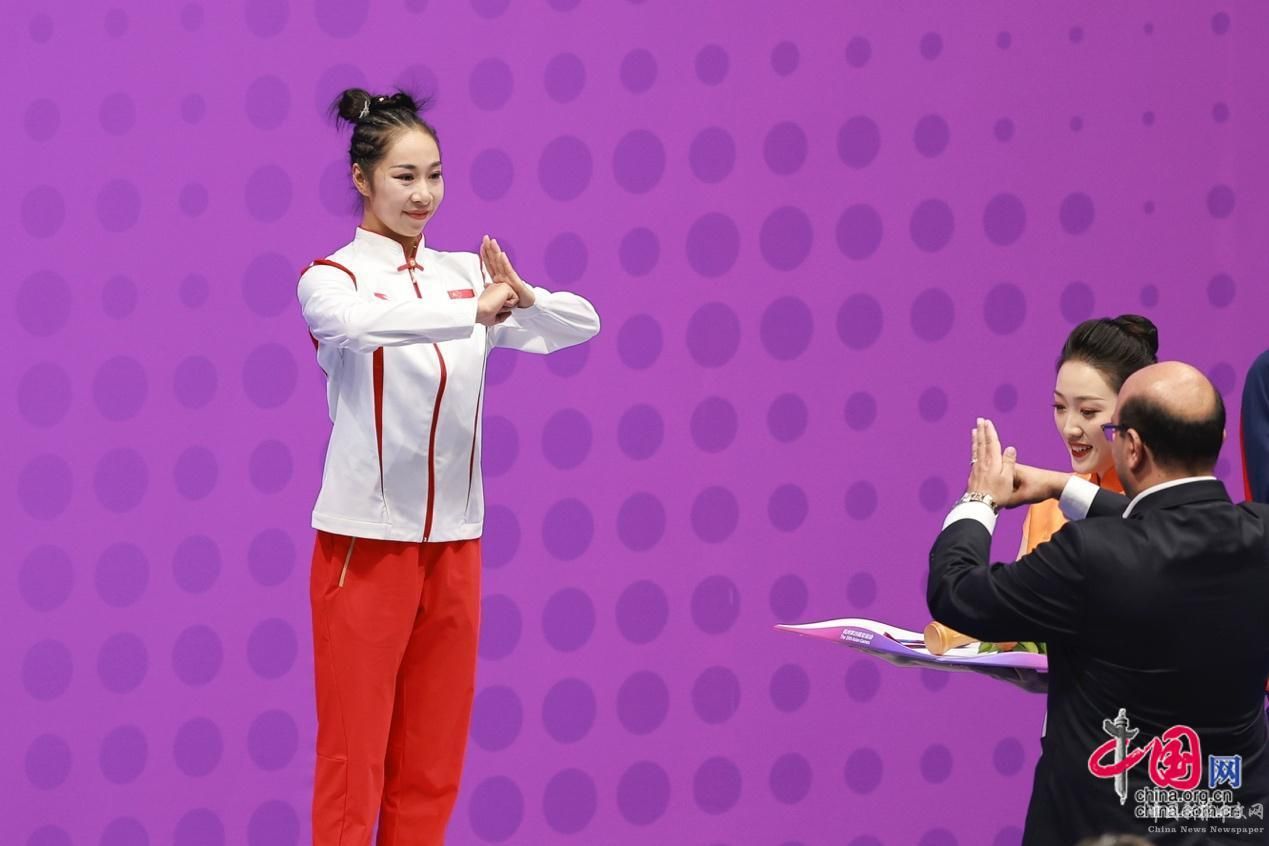 9月27日,杭州第19屆亞運(yùn)會(huì)武術(shù)女子劍術(shù)槍術(shù)全能決賽在蕭山瓜瀝文化體育中心舉行,中國(guó)選手賴(lài)曉曉19.6分的優(yōu)異成績(jī)摘取桂冠。圖為賴(lài)曉曉和頒獎(jiǎng)嘉賓相互抱拳施禮。中國(guó)網(wǎng)記者 董寧 攝影